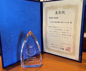 2022年7月19日 物語ファミリーコンベンションにて最優秀店舗賞を受賞しました。 7月13日に株式会社物語コーポレーションが主催する「物語ファミリーコンベンション」が開催されました。 全国26店舗のお好み焼本舗から、当社運営店舗の「お好み焼本舗 日進竹の山店」が最優秀店舗賞を受賞しました。